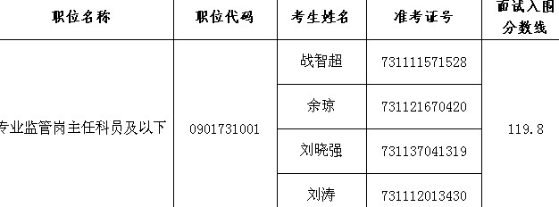 因部分考生放弃面试资格,根据公务员招考有关规定,拟在公共科目笔试合格的考生中,按照笔试成绩从高到低的顺序,递补以下考生为面试人选: