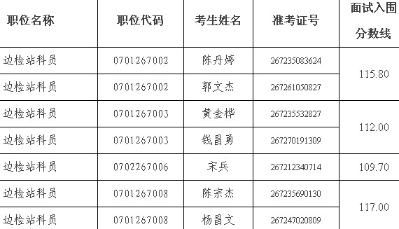 因部分考生放弃面试资格,根据公务员招考有关规定,在公共科目笔试合格的考生中,按照笔试成绩从高到低的顺序,递补以下考生为面试人选:
