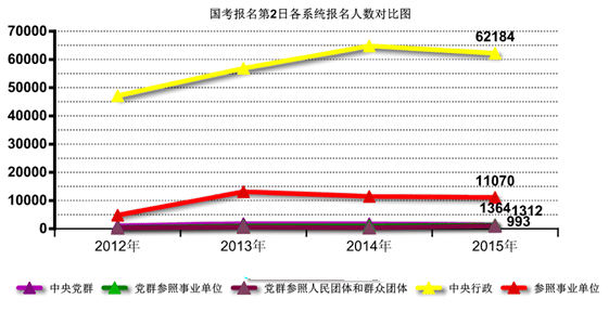报考从各系统来看,由于中央国家行政机关及其直属机构和派出机构是招录人数最多的系统,因此其报名人数也相应最多。从历年数据来看,除中央党群机关参照公务员法管理事业单位及人民团体和群众团体两个系统外,其他三个系统今年的势头也均不敌当年。