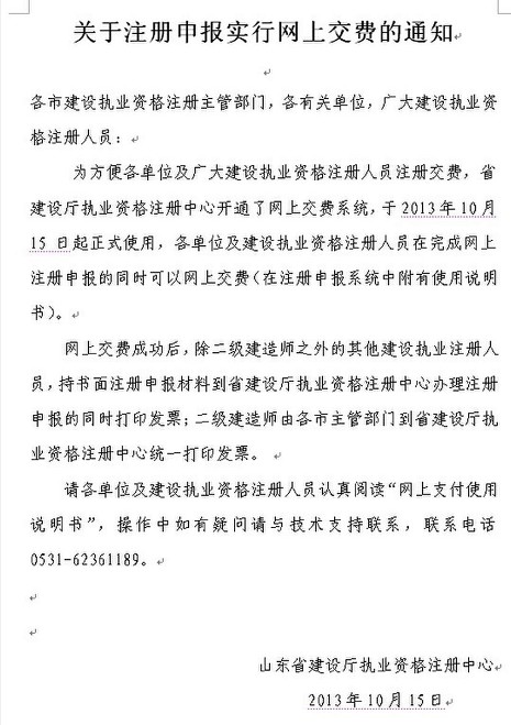摘要 山东建注中心:注册给排水工程师考试注册申报网上交费通知