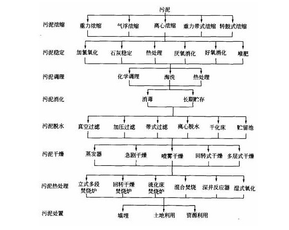 从沉淀池来的污泥呈液态,含水率常高于95%。降低污泥含水率的最简单有效的方法是浓缩。浓缩可使剩余污泥的含水率约从99.2%,下降至97.5%左右,污泥体积缩到原来的1/3左右。但浓缩污泥仍呈液态。进一步降低含水率的方法是脱水,经过脱水污泥从液态转化为固态。为了避免污泥进入环境时,其有机部分发生腐败,污染环境,常在脱水之前先进行降解,称稳定。经过稳定的污泥如果脱水性能差,则还需调理。脱水污泥的含水率仍旧相当高,一般在60%-80%左右,需进一步干化,以降低其重量。干化污泥的含水率一般低于10%。经过各级处理,100kg湿污泥转化为干污泥时,重量常不到5kg。