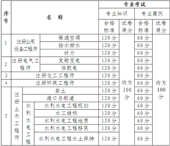(二)注册工程师(除一级、二级注册结构工程师)资格的专业考试合格标准见下表:
