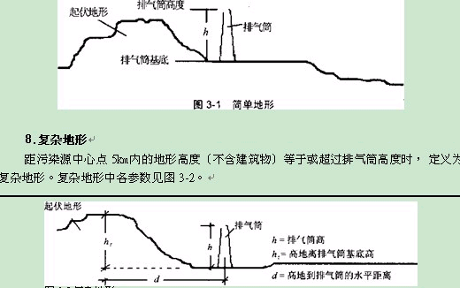 距污染源中心点5 km内的地形高度(不含建筑物)低于排气筒高度时,定义 为简单地形(图3-1)。在此范围内地形高度不超过排气筒基底高度时,可认为地形 局度为0 m。