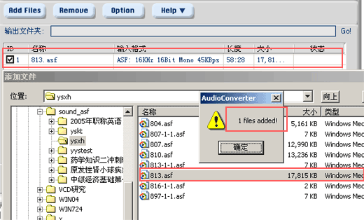 3、打开软件后点击“Add Files”按钮,添加你电脑上要转换成mp3格式的asf文件,添加成果后,在操作界面中间表框中将出现你已选择转换文件的记录,见下图: