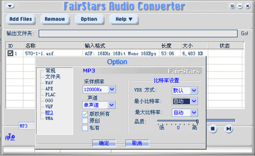 Finished! Do you want open the output folder?”(转换成功,是否要打开存放当前mp3文件目录)点击ok,打开目录即可看到转成的mp3文件.在转换之前可以点击菜单中“Option”按钮,设置mp3文件格式的转换比例、大小等属性,见下图: