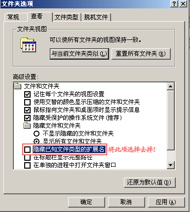 解决方法:请随便打开一个文件夹,进入“工具”菜单-“文件夹选项”-“查看”:将“高级设置”中的“隐藏已知文件类型的扩展名”默认“打勾”选项去掉,然后“确定”就可以了。见下图: