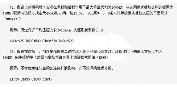 74、假设该桥箱及桥面系每孔横载的重量为4500KN/孔,活载作用下的最大支座反力为800KN,问在恒载和上题中最不利活载作用下每个支座的最大垂直反力值(KN)?