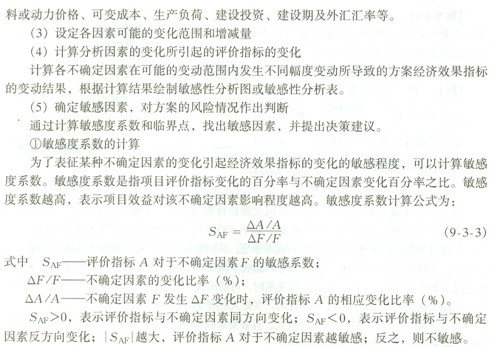 本章第二节讨论的各种经济效果评价指标,如净现值、内部收益率、投资回收期等, 都可以作为敏感性分析的指标。由于敏感性分析是在确定性经济分析的基础上进行的,就 一般情况而言,敏感性分析的指标应与确定性经济分析所使用的指标相一致,不应超出确 定性分析所用指标的范围另立指标。当确定性经济分析中使用的指标比较多时,敏感性分 析可围绕其中一个或若干个最重要的指标进行。