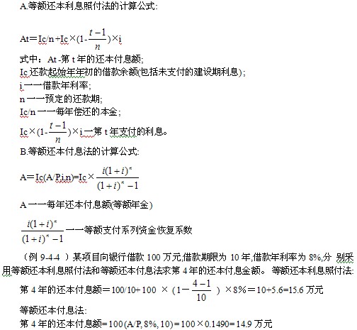 不同还款方式对项目(企业)经济效益会产生不同的影响,企业要通过分析,选择手 利的还款方式。下面说明等额还本利息照付法、等额还本付息法的计算公式。