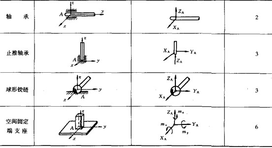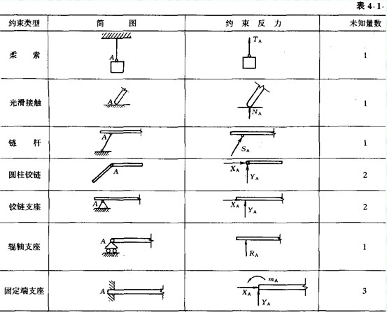 阻碍物体运动的限制物称为约束。约束对被限制物的作用力称为约束反力,简称反力。约束反力以外的其他力统称为主动力。约束反力的方向恒与约束所能阻止的物体的运动或运动趋势的方向相反。表4—1—1列出了工程中常见的几种基本约束类型及其约束反力。