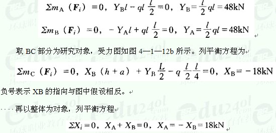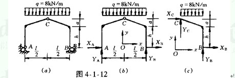 【 例 4—1—l】 图4—1—12a所示为一三铰刚架,其顶部受沿水平方向均匀分布的铅垂荷载的作用,荷载集度为Q=8kN/m。已知:l=12m;h=6m;a=2m,求支座A、B的的反力。刚架自重不计。