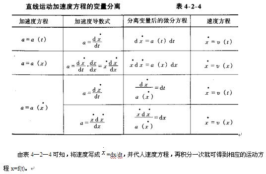 为便于进行定积分运算,有时要适当地进行变量置换。即把a用适当的导数形式来表示,使微分方程仅包含两个变量,并可分别分离在微分方程等式的两边,逐次积分,即可得动点的速度和运动方程。现以动点沿I轴的直线运动为例,将加速度方程的变量分离方法列于表4—2—4中。