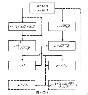 如已知直角坐标法描述的点的运动方程(包括轨迹方程),求点沿轨迹的运动方程、切向加速度、法向加速度和曲率半径p等。现以点的平面曲线运动为例,图示这一问题的求解途径(图4-2—2)。图中虚、实线分别图示了某些物理量的两种求解方法。
