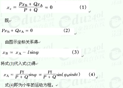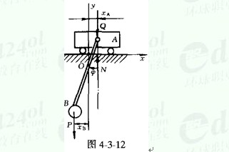 [例4-3-5] 小车A重Q,下悬一摆如图4—3—12所示。摆按规律φ=φ0sinkt摆动,设摆锤B重为P,摆长为J,摆杆重量及各处摩擦均忽略不计。若运 动开始时系统的质心速度等于零,试求小车的运动方程。