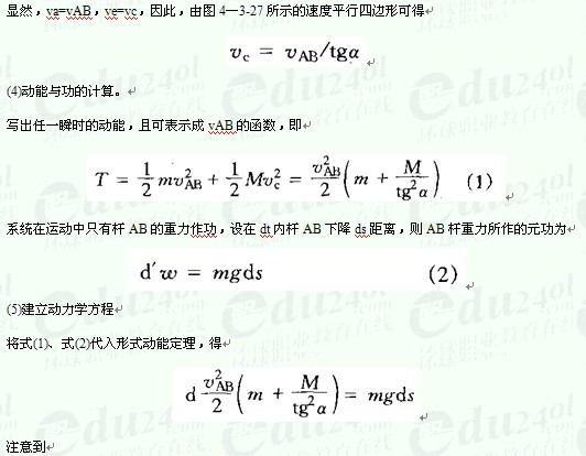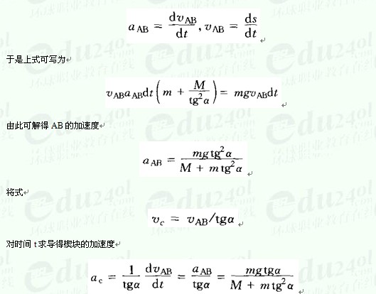 [例4-3-9] 质量为m的直杆AB可以自由地在固定套管中移动,杆的下端A点搁在质量为M、倾角为α的光滑楔块C上,而楔块C放在光滑的水平面上,如图4-3-27所示。由于AB杆的压力,楔块沿水平面向右运动,因而杆AB下降。试分别求出任一瞬时杆AB和楔块C的加速度aAB和ac。