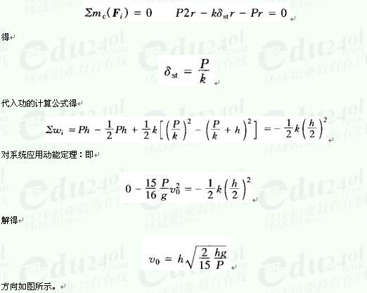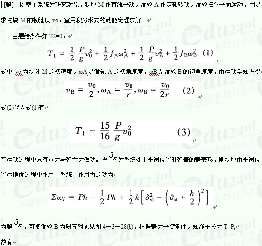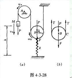 [例4-3-10] 系统如图4—3—28所示。已知:物块M和滑轮A、B的重量均为P,且两滑轮视为均质圆盘,弹簧的刚性系数为k,绳重不计,绳与轮间无相对滑动。当M离开地面h时,系统处于平衡。现给M以向下的初速度vo,欲使其恰能到达地面。试问vo应为多少?