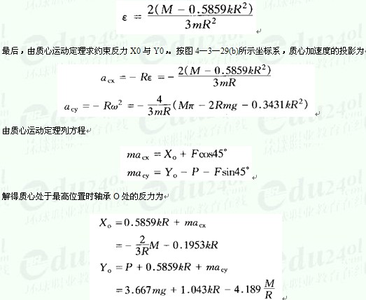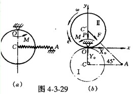 [解] 取圆盘为研究对象。其在铅垂平面内作定轴转动,质心作圆周运动。当圆盘的质心转到最高位置时,作用在其上的力有重力P、弹性力F、矩为M的力偶及轴承处的反力X0与Y0,如图4-3-29(b)所示。由题意知,欲求圆盘达最高位置时的反力X0与Y0,必须先解出该瞬时圆盘质心的加速度,故本题属动力学第一类和第二类的综合问题。