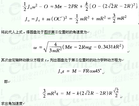本题在求得ω后,为什么不用dω/dt求ε呢?因上面用动能定理求到的角速度是质心处于最高位置时,角速度的特定值,故不能求导。如求——般位置的ω,计算弹性力的功很繁,因此,不用这种方法,而是用定轴转动微分方程求ε。所以用哪个方法,哪个定理,求什么量要根据题目的具体情况而定。