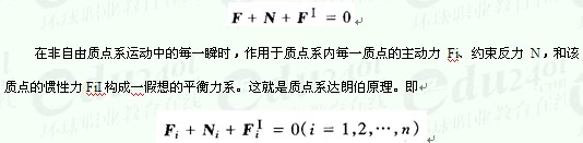 达朗伯原理是一种解决非自由质点系动力学问题的普遍方法。这种方法将质点系的惯性力虚加在质点系上,使动力学问题可以应用静力学写平衡方程的方法来求解,故称为动静法,动静法在工程技术中得到广泛的应用。