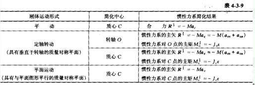 对刚体动力学问题,可以将刚体上每个质点惯性力组成惯性力系,用力系简化的方法,得出简化结果。这些简化结果与刚体的运动形式有关。具体结果见表4-3-9。