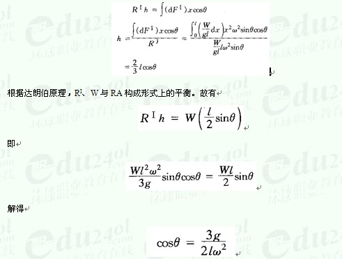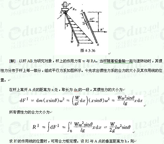 [例4—3—12] 均质细杆AB重W,长l,其一端A铰接于匀速转动铅垂轴上,如图4-3-36所示。设角速度为ω,求相对平衡时杆与铅垂轴所成的角θ。