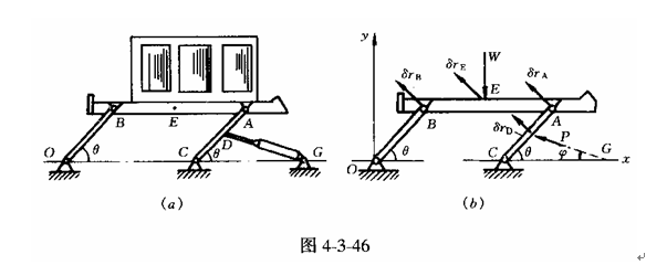 (3)分析各构件的运动,并作出系统的虚位移图。因为升降台BA作平动,所以B、E、A点的虚位移相等,即δrB=δrE=δrA。设D点的虚位移为δrD,其大小δrD=0.5δrA。各点虚位移如图4—3—46(b)所示。