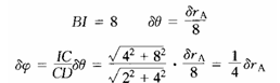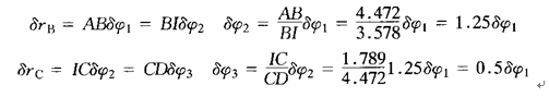 设AB杆有一虚位移δφ1,相应地CD杆有δφ3,BC杆的瞬心为I,虚位移为δφ2。于是得图4-3-47(b)所示的虚位移图。