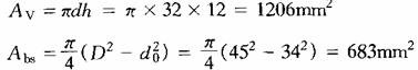 [解] 首先分析销钉的剪切面和挤压面面积,由图可见,销钉所受轴向拉力P将在钉头内形成一个高度为h=12mm,直径为d=32mm的圆柱形剪切面和一个外直径为D=45mm,内直径为d0=34mm的环形挤压面。于是得