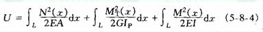 在微小变形情况下,每一基本变形下的内力分量在其他基本变形时并不作功,故组合变形时的弹性变形能等于各基本变形下变形能的总和。设轴力、扭矩、弯矩均为截面位置x的函数则