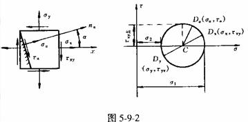 若已知一平面应力状态σx、σy、τxy,则取横坐标为σ轴、纵坐标为τ轴,选定比例尺; 由(σx,τxy)确定点Dx,(σy,τyx)确定点Dy;连接DxDy交σ轴于C,以C为圆心, 或 为半径作圆,即得相应于该单元体的应力圆。