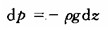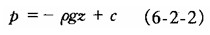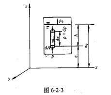 在容器中,取一圆柱体,它的水平截面积为dA(图6-2-3),在重力作用下,水平方向因表面力大小相等,方向相反。在竖直方向,作用在底面的压力等于p,方向向上;顶面的压力等于p+dp,方向向下;质量力是重力pgdzdA方向向下,各力处于平衡状态,有pdA—(p+dp)dA—pgdAdz=0,用dA遍除各项可得