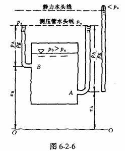 设一封闭容器如图6-2-6所示,液面压强p0。若在容器壁上任意取A、B两点,并接上开口的玻璃管(称测压管),则测压管内的液面离基准面的高度都由位置高度z和压强高度p/ρg两部分组成。在工程中常用“水头”代表高度,所以z称位置水头,p/ρg称压强水头,z+p/ρg 称测压管水头,从图中可以看出