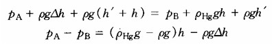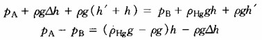 若两水管为同一平面时(Δh=0),则其压差PA—pB=(ρHg-ρ)gh或