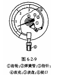 量测较大压强,可用压力表,其优点是结构简单、安全可靠。通常金属压强表内装有一根一端开口,一端封闭的铜制弹簧弯管,如图6-2-9所示,开口端通过短管和被测定压强的液体相通,封闭端可自由伸缩、并以齿轮与指针相连;施测时,弹簧弯管在液体压力的作用下,截面变形,促使管封闭端张开伸直、带动齿轮,转动指针,把液体的相对压强在表面读数盘上指示出来。