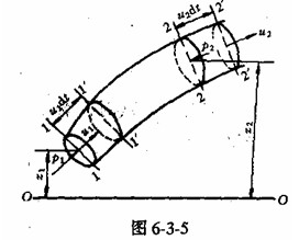在流场中选取一元流,如图6-3-5所示。在元流上取断面1-1和断面2-2,两断面的高程和面积分别为z1、z2和dA1、dA2。两断面的流速和压强分别为u1、u2和p1、p2。以两断面间的元流段为研究对象,在dt时间内由原来的1122位置移动到1'1'2'2'位置,断面1—1和断面2-2分别移动了uldt和u2dt的距离。