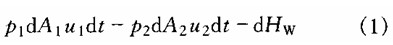在断面1—1所受压力pldAl,所作正功pldAluldt,断面2-2所受压力p2dA2,它与流动方向相反所作的功是负的,等于—p2dA2u2dt。元流侧面所受的压力和元流流向垂直,没有作功。而沿元流侧表面还有和流体方向相反的内摩擦阻力作了负功—dHw,因此外力作功为