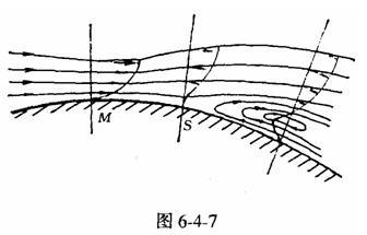 上述平板边界层不出现边界层与壁面脱离的分离现象。但当黏性流体绕过弯曲壁面时,如图6-4-7所示,在M点以后流速沿流减小,压强沿流逐渐增加,出现逆压梯度∂p/∂x>0。边界层外的流体质点,由于具有较大的动能,可以克服与流动方向相反的压力差,继续向前流动;而边界层内流动阻力影响较大,流体质点具有的动能较小,而且愈靠近边壁具有的动能愈小,以致流到某一点后因动能耗尽而停止。这一点称边界层的分离点S。在分离点S的下游,靠边壁的水质点在反向压力差作用下,产生反向回流,于是在边壁和主流之间形成旋涡区。这就是边界层的分离现象。