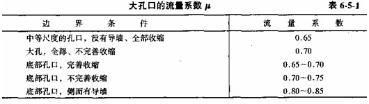 对于d/H>0.1的大孔口,也可近似应用小孔口的公式,此时Ho为大孔口形心上的作用水头。流量系数见表6-5—1。
