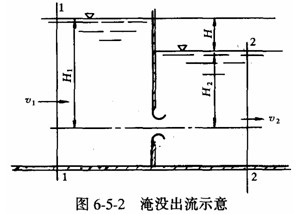 式(6-5-5)与式(6-5-4)形式完全一样,流量系数μ值也相同,只有H0的涵义不同。当容器相当大时,v0≈0和v1≈v2≈0。可以认为H0=H,则自由出流时的作用水头为液面至孔口中心的深度;淹没出流时作用水头为两液面的高差。