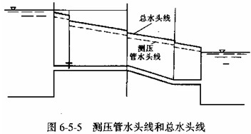 测压管水头线和总水头线绘于图6-5-5上。定性绘制时不必算出每段的沿程损失和每个局部损失的大小,按比例绘于图上。只需根据其特点定性地绘出:1)无能量输出时,总水头线总是下降的斜直线。管径不变,单位长度的损失相同,总水头线坡度不变。2)在有局部损失处,总水头线的下降集中绘在发生突变处。虽然局部损失是在一段长度内完成的,但为了简化,将其画在一个断面上。如图6-5-5,总水头线在进口、阀门、弯头、出口的各断面上均有突降,其下降值即为该处局部损失值。3)测压管水头线总是在总水头线的下方,其高差即为该断面的流速水头值。图6-5-5中,由于管径不变,流速不变,所以总水头线与测压管水头线平行。因总水头在出口处的损失为一个流速水头,所以测压管水头线对于管道出口断面,可从下游水面这一点开始画,逐段推出总水头线的平行线,直至进口断面。4)测压管水头线与管人轴线之间的高差即为该断面管中心点的p/ρg。由此可以清楚地看出沿着管轴线压强的变化。知道何处压强最大和最小。再通过写能量方程具体求出压强数值满足工程上的需要。5)注意管道进口和出口两断面上左右两侧(即管中和水池中)压强变化的区别:出口断面上,左右两侧压强相等。这是因为左侧管道中有流速,流体具有单位动能v2/2g,但在右侧水池中流速被当作为零,即动能为零。动能何处去了呢?在出口过程中全部损失了(出口损失恰好为1个流速水头),因此压能没有变化。进口断面上,左侧水池中流速被当作为零、动能为零。进入管道后(右侧),有一进口损失,还有动能。损失的是压能,转化为动能的也是压能,因此压能在进入管道后下降很多,管道左右侧大不相同。