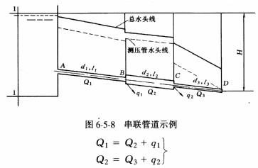 由不同直径的管段顺次联接而成的管道称为串联管道。如中间无流量分出,则各管段流量相同。由于各管段直径不同,流速不同,需分段计算水头损失。整个管道的水头损失等于各段损失之和。
