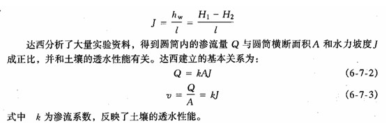 达西在1856年对具有矩形横截面、中间装满砂的容器中水流进行实验研究(图6-7—1),得到渗流基本定律。如图6-7-1所示,H表示上下游水位差,则渗流的水力坡度为