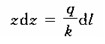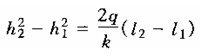 图6-7-2所示,不透水层顶部(或含水层底板)水平。地下水面(包括无压水的自由表面及有压水的测压管水头面)在集水廊道未排水或抽水前的水面称地下水静水面,排入后到达恒定状态的水面称动水面,动水面的水面线也叫浸润曲线。还假定集水廊道开挖到不透水层,于是集水廊道底面不进水。集水廊道垂直于底面方向单位宽度(B=1)的单宽流量q=vz=kJz,根据裘布依,J=sinθ≈tgθ=dz/dl,q=kztgθ=kz·dz/dl,令距离廊道l1和l2的地下水深分别为h1和h2,将上式分离变量,