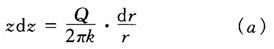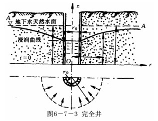 在具有自由表面的无压含水层中打出的井,称为潜水井。一种是井底深达不透水层,如图6—7-3所示称完全井。另一种是抽水时地下水从四周轴向对称地流入管井;过流断面是一圆柱面,面积 ;流速为kJ=k·dz/dr,所以流量