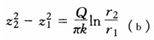 在距井轴心r2和r1的地方各打一个观测地下水水位的钻孔,求得与抽水量相应的水位z2和z1,利用上式可求渗流系数是值。