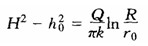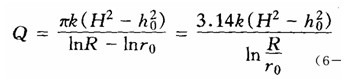 为了计算井的涌水量Q,引入井的影响半径R的概念:在浸润漏斗上,有一半径r=R的一个圆,在R范围以外,浸润漏斗的下降H—z趋于零,即天然地下水位不受影响,距离尺称为井的影响半径。如果对式(a)积分时,取r=r0和r=R及z=h0和z=H为积分上下限,得