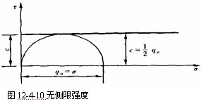 无侧限又称单轴压缩试验。相当于三轴试验中σ3=0的条件。试验结果只能得到一个应力圆,见图12-4-10。若抗压强度为qu'则不排水强度