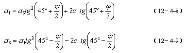 将土的强度包线与破坏条件的应力图画在同一坐标图上,见图12-4-15所示,则A点 所代表破裂面mn平面上的法向应力和剪应力就可以按公式12-4-6求出;在极限平衡条 件下,大主应力σ1与小主应力σ3之间关系可通过图12-4-15 (b)几何关系求得: