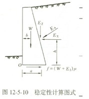 在上列内容中,地基的承载力验算与一般偏心荷载作用下基础的计算方法相同,即要 求基底的最大压应力σmax=1.2R (R为地基土容许承载力)。墙身强度验算应根据墙体材料分别按砖石结构、素混凝土结构或钢筋混凝土结构有关计算方法进行。挡土墙埋深较浅时,可不考虑被动土压力的影响,稳定性验算按图12-5-10所示力系进行。