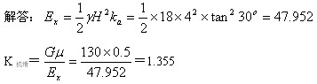 例:某挡土墙墙背直立、光滑,填土面及基底水平, H=4m,填土为无黏性土,内摩擦角Φ=30°,重度γ= 18kN/m3挡土墙自重G=130kN/m,土对挡土墙基底的摩擦系数 μ=0. 5,则该挡土墙抗滑移稳定安全系数为(B)。